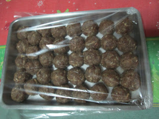 Então, ralei uma cebola branca média e acrescentei à carne; juntei 2 colheres (sp, cheias) de FSG (farinha sem glúten) e 1 ovo grande. Mexi bastante com a referida colher,até que a carne estivesse bem trabalhada e então, calcei umas luvas 'culinárias' e fiz as almôndegas. Fui colocando-as num tabuleiro.